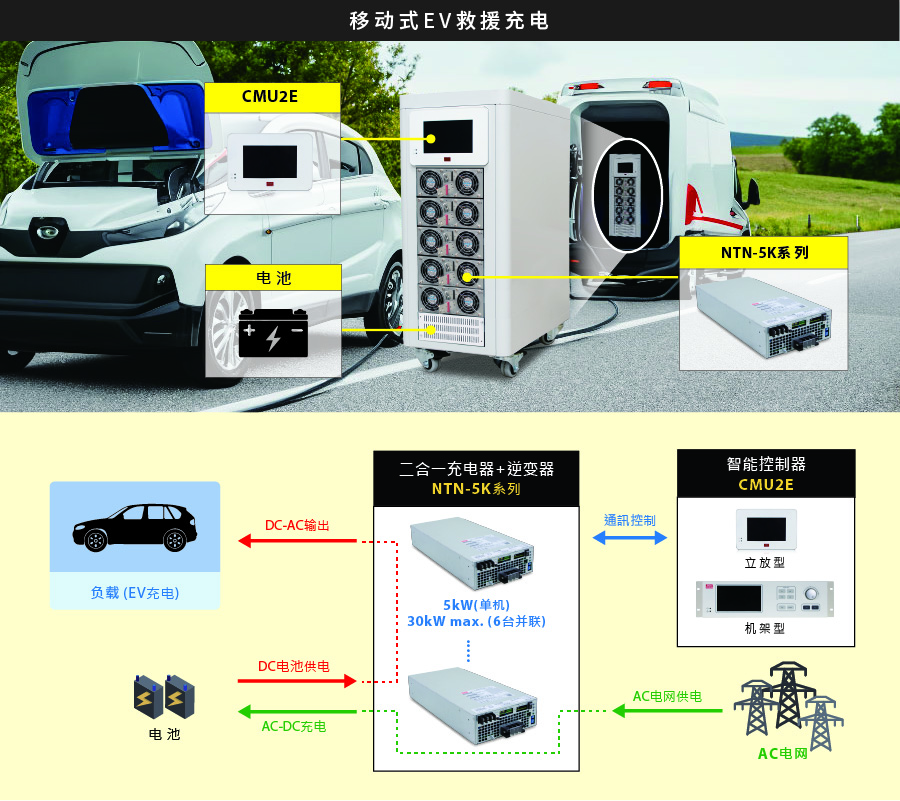 - 采 5KW 單機模塊化設計,AC 輸出可彈性并聯至 30KW (1+5 臺),擴充瓦數非常彈性
