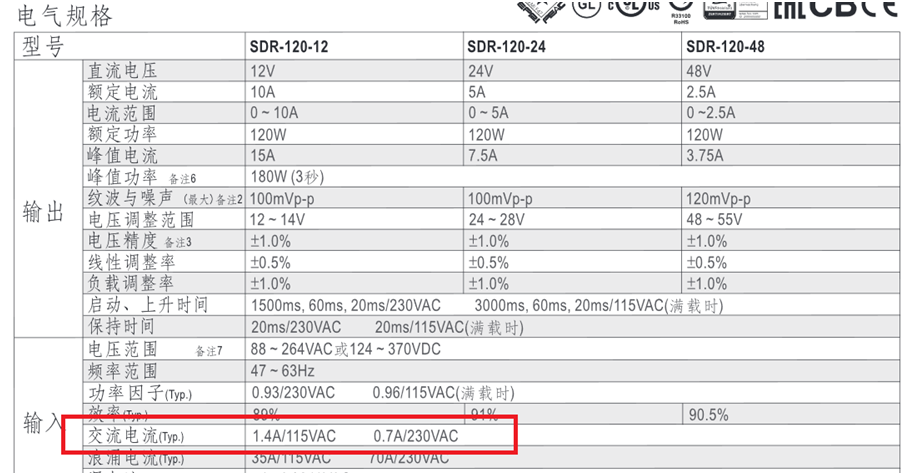 根據以下明緯官網SDR-120規格書得知于230VAC下,滿載輸入交流電流為0.7A。