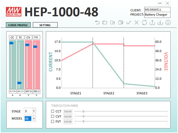 用戶只需要在軟件中選擇二段式充電模式,HEP-1000-48便可用于鋰電池充電,可調(diào)整的電壓及電流范圍不變。例如給一顆20Ah,最大充電電壓為56V的磷酸鋰鐵電池充電,使用者可將圖四所示的‘CV’及‘CC’選項(xiàng)調(diào)至56V及17.5A。如此可得到最快速的充電方案。使用者也可以選擇較低的恒流點(diǎn)避免高電流導(dǎo)致的高溫和較低的恒壓點(diǎn)以保證不會(huì)過(guò)度充電。