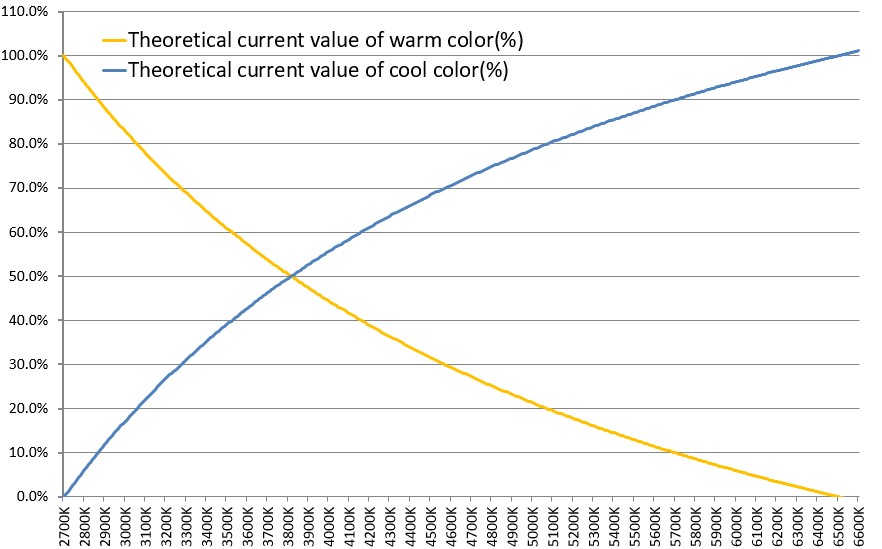 可調色溫和亮度的LED燈具,內部是采用了冷、暖色溫兩路光源輸出,如下圖三,一路為冷光(6500K),一路為暖光(2700K),每一路相對獨立。如下圖四,透過調設每一路光源驅動電流的比例,可以實現色溫調設;在一定色溫條件下,同比例改變兩路光源驅動電流的大小,可以實現亮度調設。
