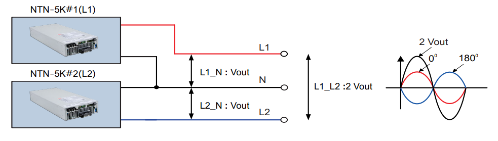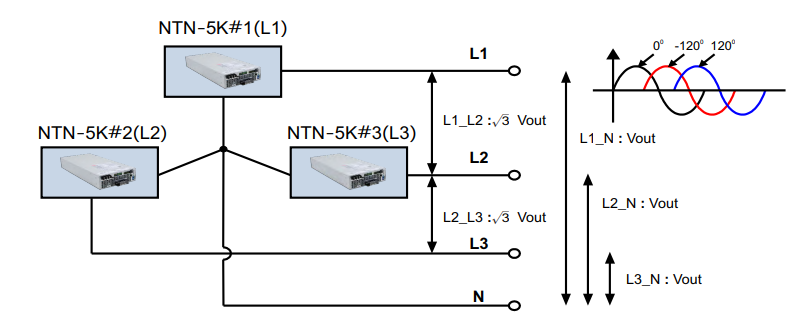 明緯新推出的 NTN-5K 是一款 5000W 高可靠離網正弦波的 DC-AC 逆變器,內建交流充電器和 UPS 功能 (交流旁路)。搭配電池適用于住宅、商業、船舶、汽車、礦山、建筑工地與沒有市電的偏遠地區。除了可單相使用外,也可以使用 3 臺并按照以下的配接方式組成三相四線式電源,應用于三相四線 (L1/L2/L3/N) 設備或分別配接相電壓 (L1/L2/L3-N) 于單相設備。