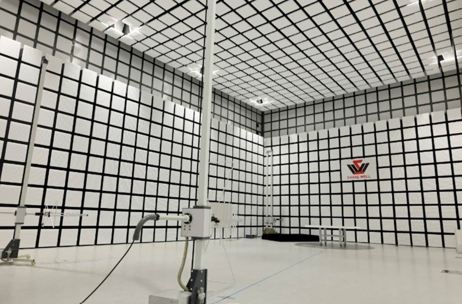 其實,墻面鋪設的是昂貴的吸波棉、吸波磚,具有消除電磁波、防止噪聲反射的功能。這是負責測試電磁與輻射干擾的十米法半電波暗室,作為第三方獨立營運的檢測與認證實驗室,符合國際級標準要求,為全球客戶提供優質的測試與認證服務。